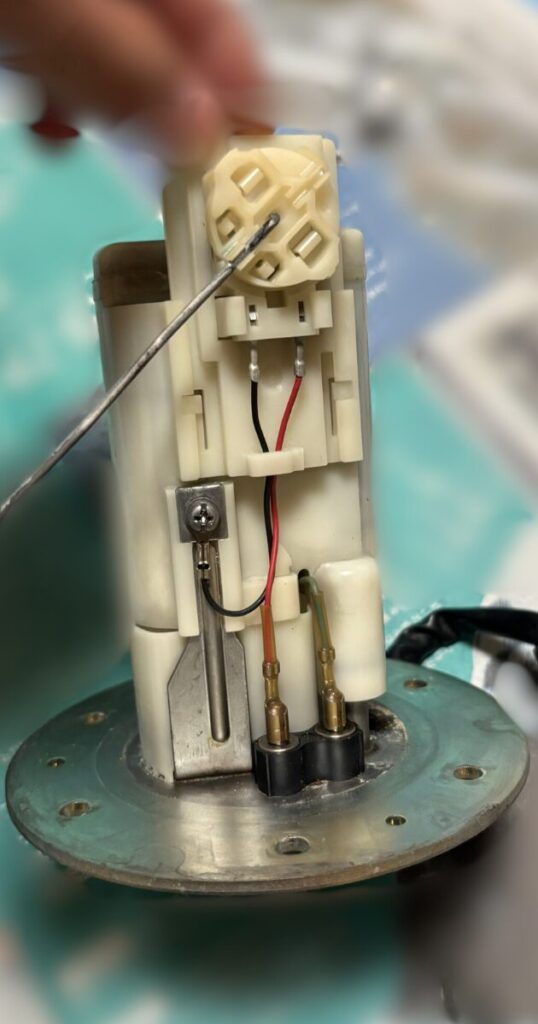 - イグニッションONで「ウィーン」という音がしない: タンク内のポンプが作動していない証拠です。あまりお勧めしませんが燃料ポンプASSYでバッテリー12Vを少し流してみてポンプが動いているか確認できます。